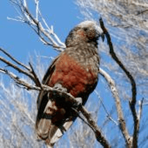 North Island Kaka use Mauao and Moturiki occasionally as part of a wider circuit of feed trees. You are lucky to see one, but where there is one there are usually a group. Keep an eye out. Usually you can hear them before you see them, as their calls are quite distinctive (think of a Tui with a crashing hangover)